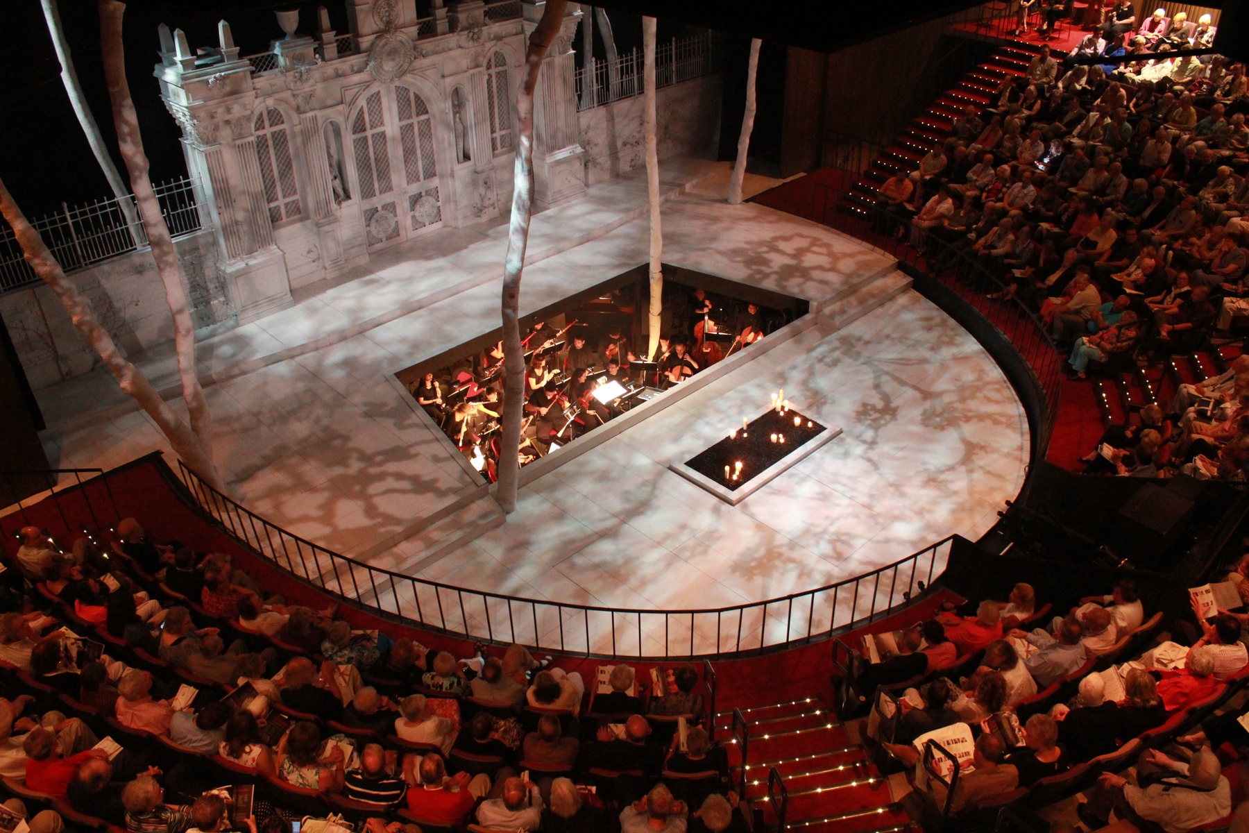 The Blank Performing Arts Center’s mainstage, called Pote Theatre, successfully incorporated both a traditional proscenium design and a thrust-stage auditorium. This unique configuration, which put the orchestra and conductor in the center of the action for opera productions, reflected a wave of “prairie populism” that was revolutionizing opera in America and was centered in the Midwest.